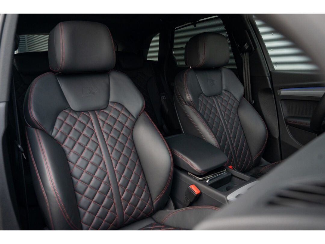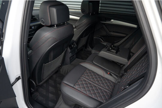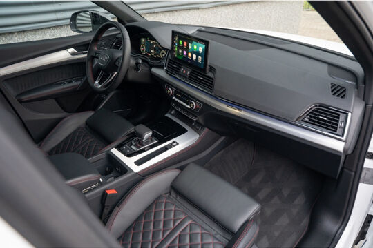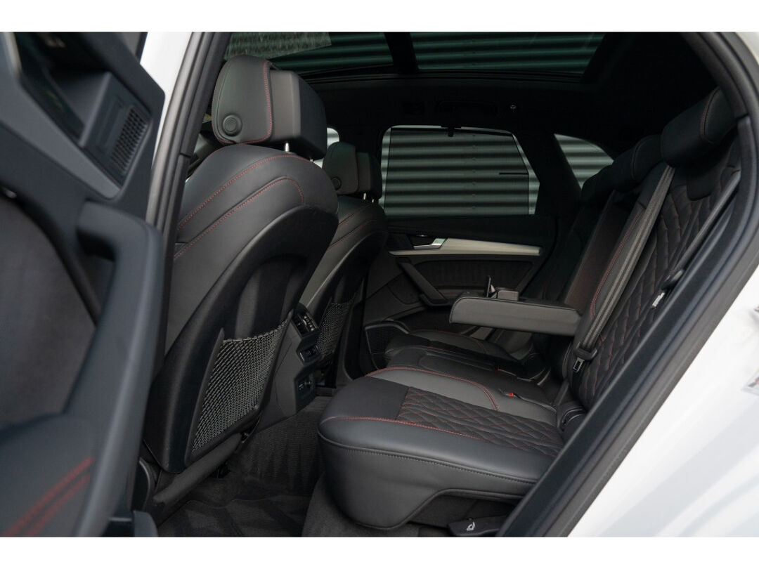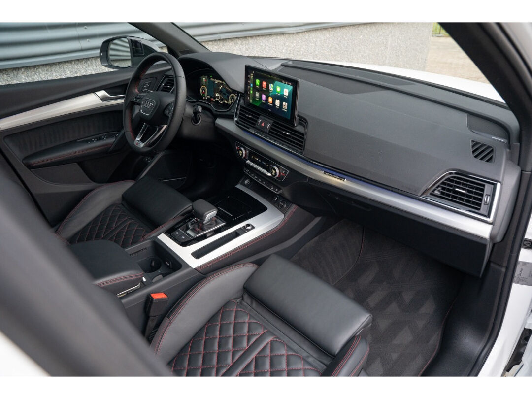 Het interieur van deze Audi Q5 is voorzien van Decordelen Accentdelen in Zwart glimmend, wat zorgt voor een luxe uitstraling. Daarnaast is het uitgerust met het Optiek-pakket Zwart, wat de stoere uitstraling van deze SUV nog verder benadrukt. Met de comfortabele RS-Stoelen en dakbekleding van stof in het zwart, geniet je van elke rit in stijl en comfort.